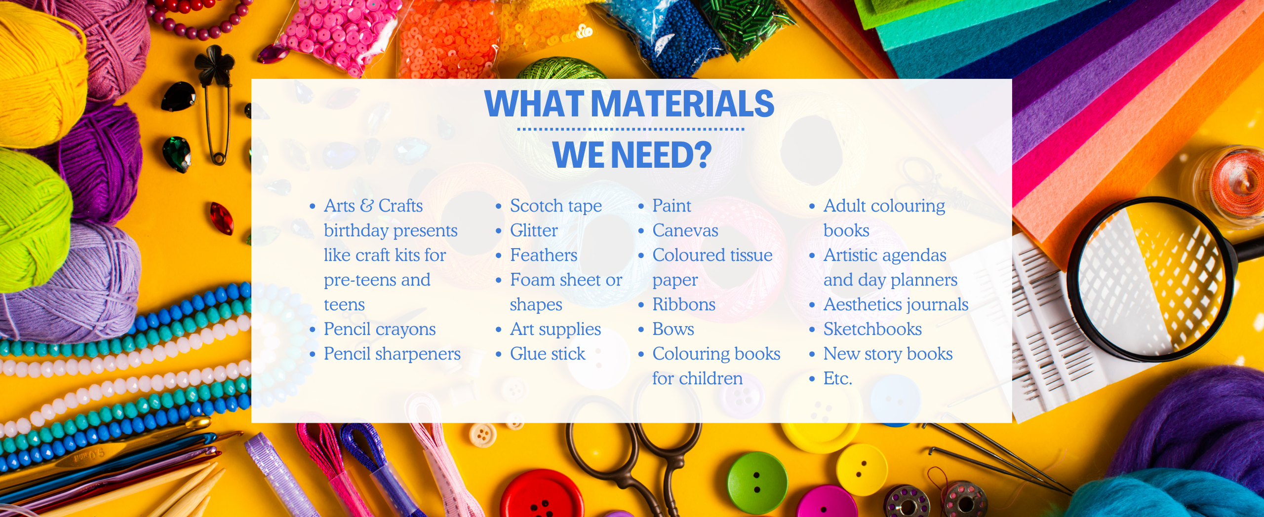 We kindly accept gently used or new arts and crafts materials. We can create craft activities with all kind of materials.