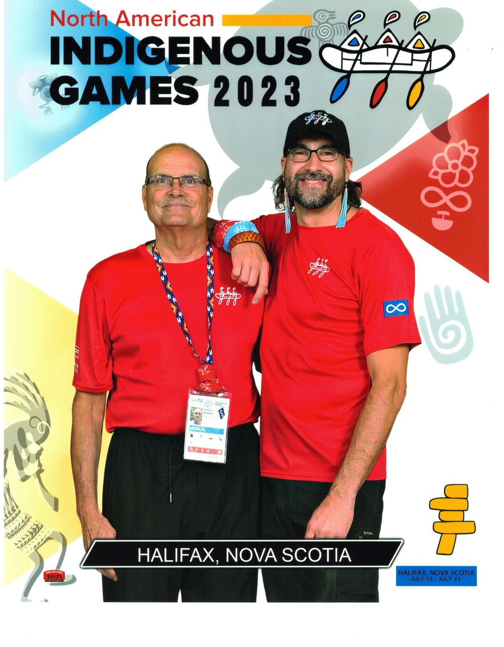 Dr Darrell Menard with his son Dr Matthew Menard at the 2023 North American Indigenous Games.