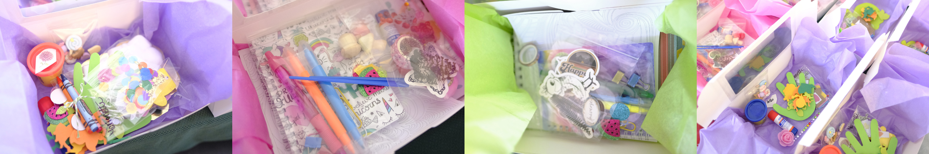 We settled on providing paints, colouring books, pencils, markers, etc. We also decided, because we just received amazing donations from the community, to make small boxes to offer individuals surprises to the women and children in need. Plus, we were just before Easter and we also received materials for Easter loot bags. So it was possible to prepare little surprise boxes with craft activities for the children.
